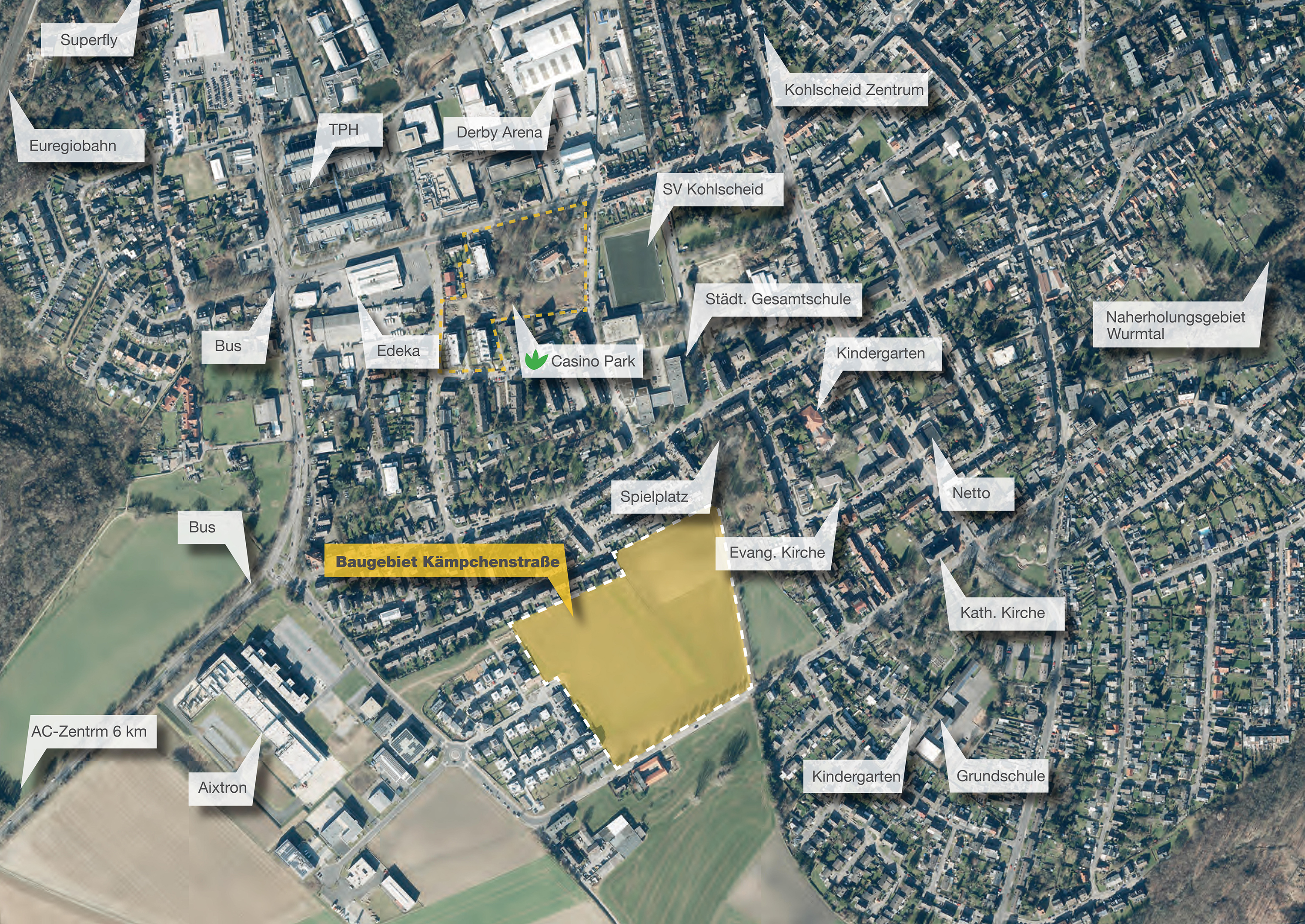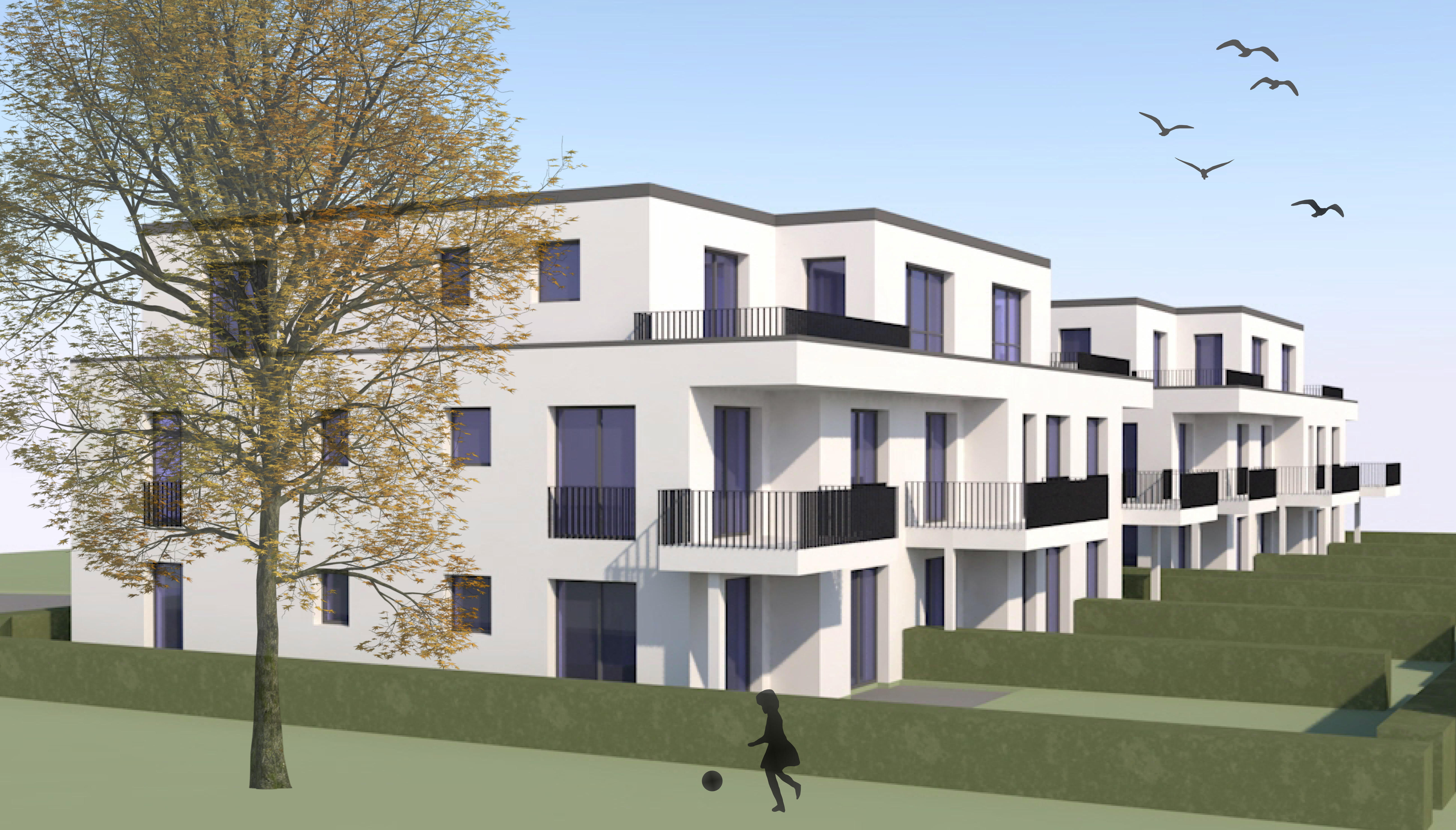 Im Wohngebiet Kämpchenstraße, in der Josef-Aretz-Straße 8 und 10, entstehen zwei moderne Mehrfamilienhäuser mit jeweils acht Eigentumswohnungen. Das zweigeschossige Gebäude mit einem Staffelgeschoss beinhaltet ein großzügiges, schwellenfreies Treppenhaus mit einem barrierefreien und rollstuhlgerechten Aufzug, der vom Untergeschoss zu den einzelnen Wohngeschossen führt. Neben dem Haus befindet sich der Zugang zu den eigens für die Nutzer der Wohnungen zur Verfügung stehenden Garagen und PKW-Stellplätzen. Jeder Wohnung steht eine Garage und ein Stellplatz zur Verfügung, die über einen Garagenhof erschlossen werden.