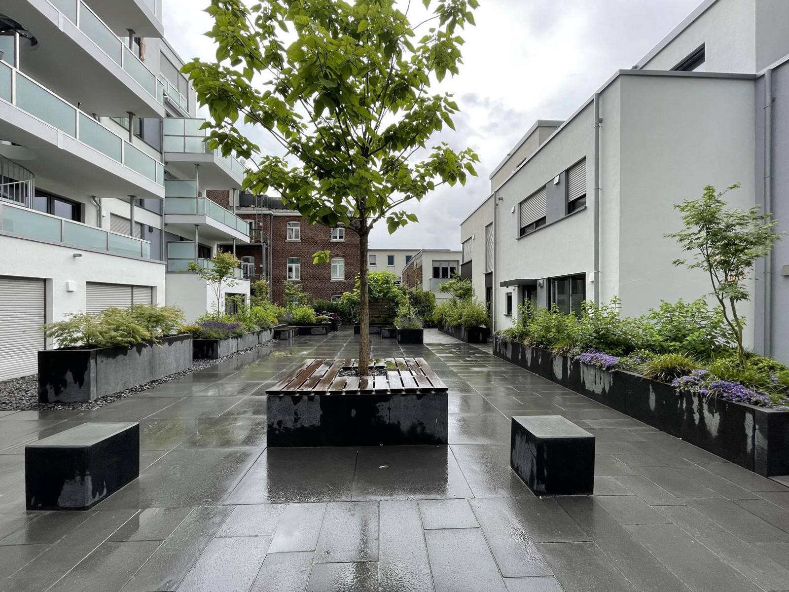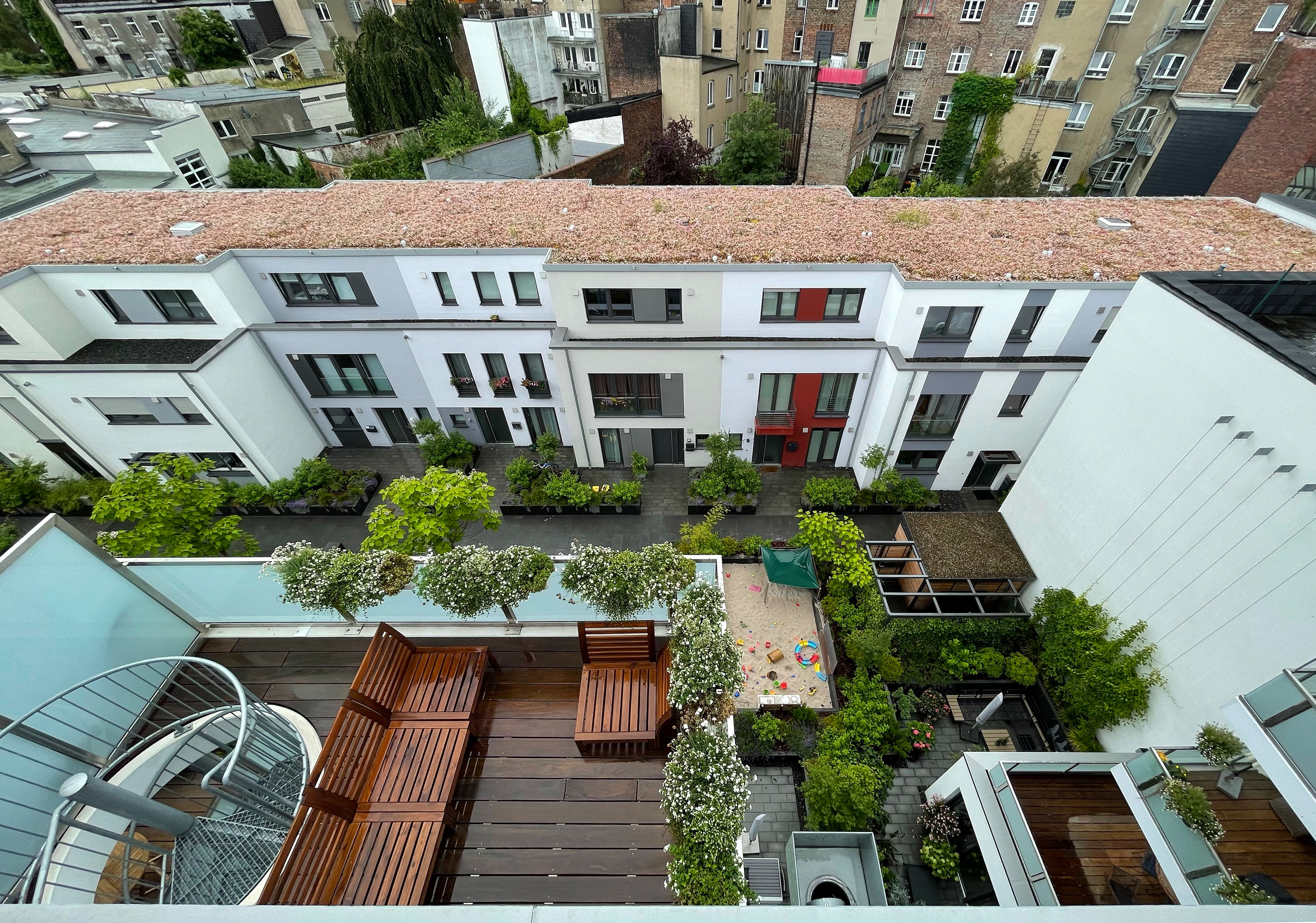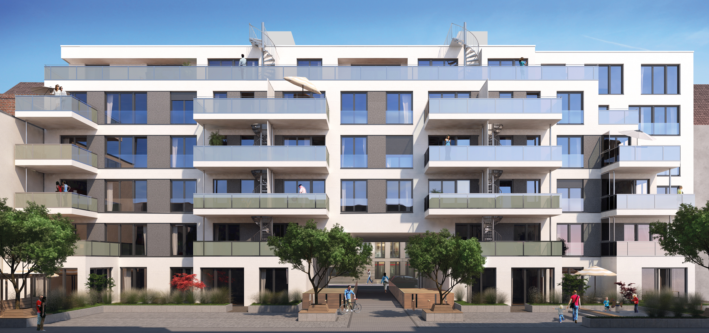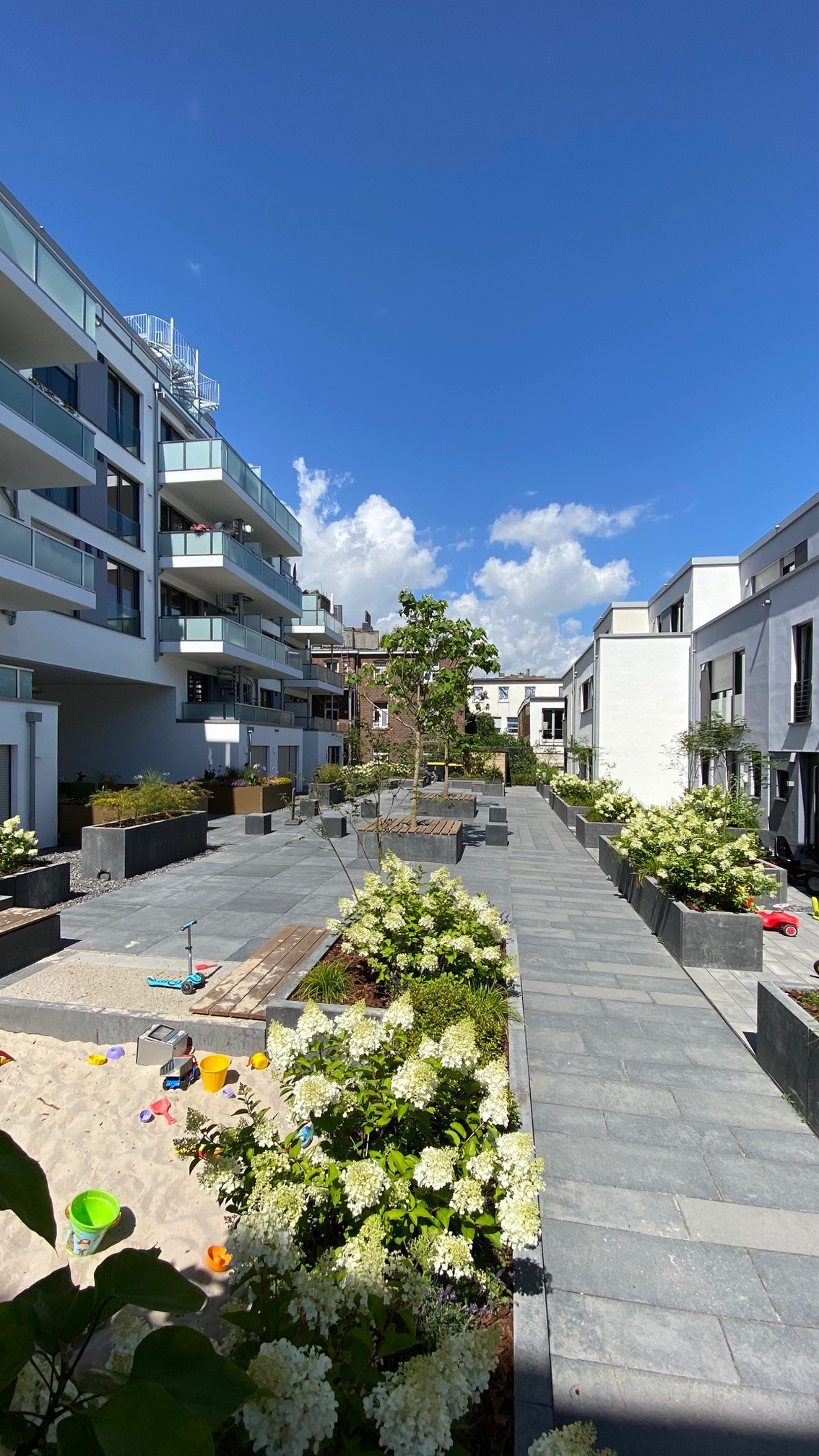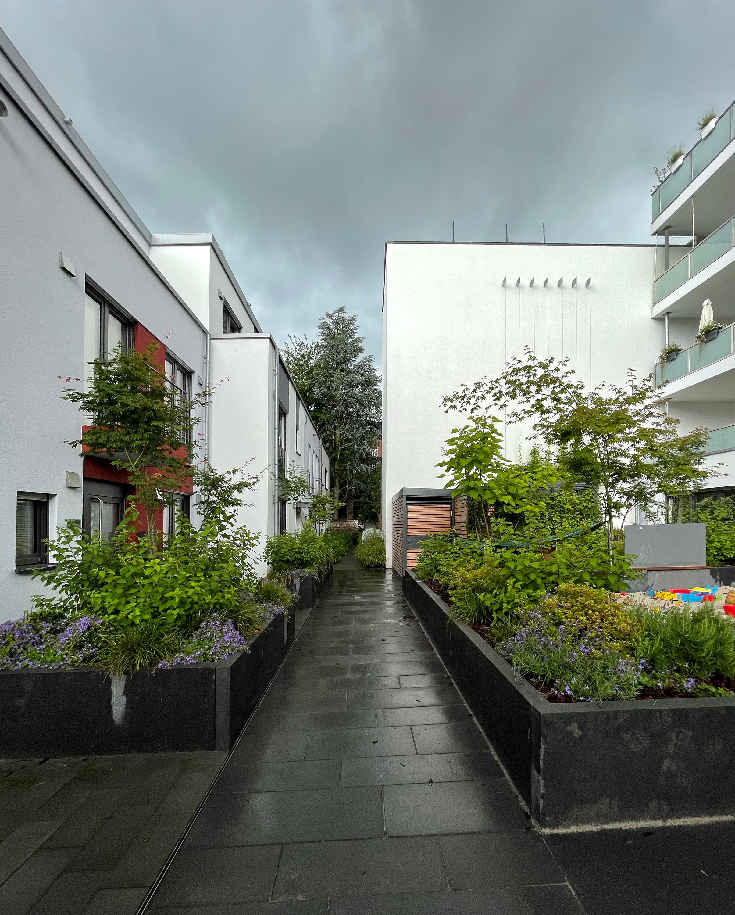 Ein repräsentativer zweigeschossiger Durchgang öffnet den Zugang zum begrünten Hof, der eine angenehme Aufenthaltsqualität für die Bewohner bietet. Im ruhigen Innenbereich liegen neun individuelle Einfamilienhäuser mit signifikanten Fassaden und großzügigen Grundrissen. Jedes Stadthaus hat 2 Vollgeschosse und ein zurückgesetztes Staffelgeschoss sowie einen eigenen zum Südosten orientierten Garten mit Terrasse.